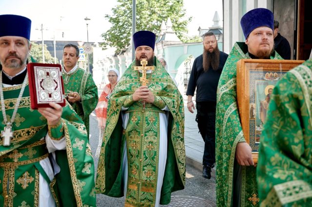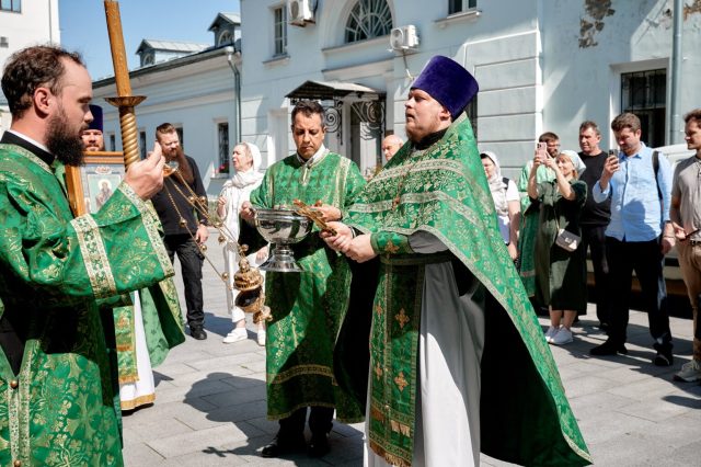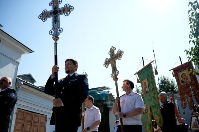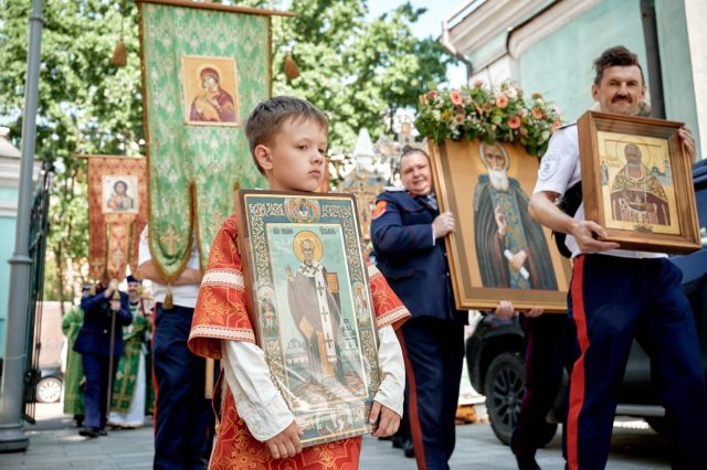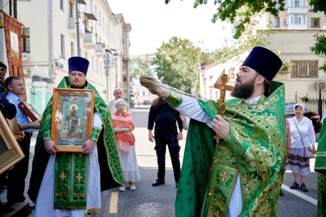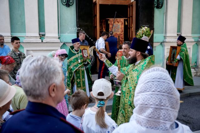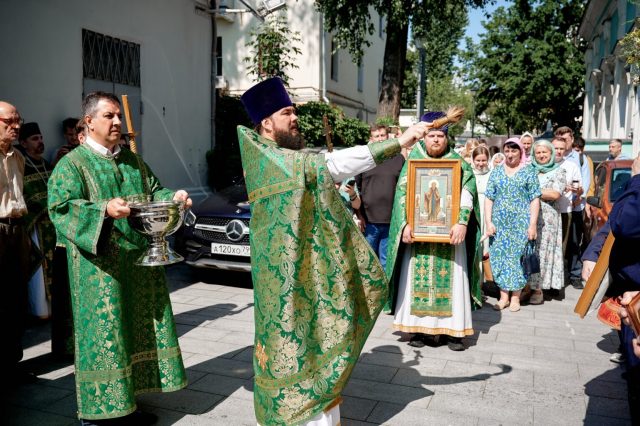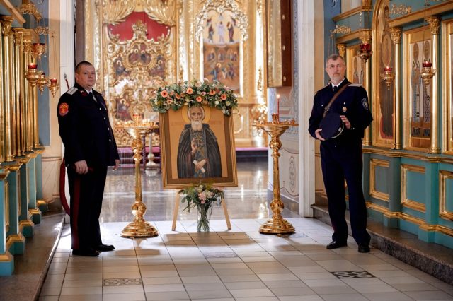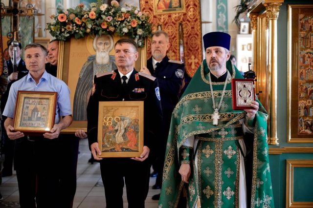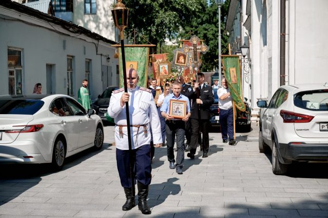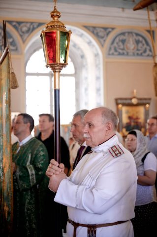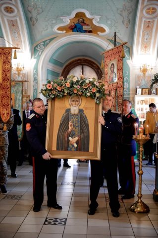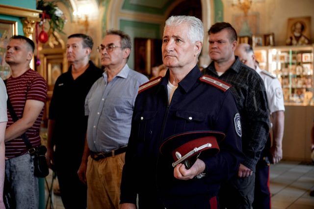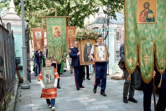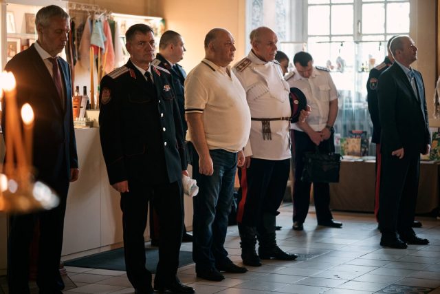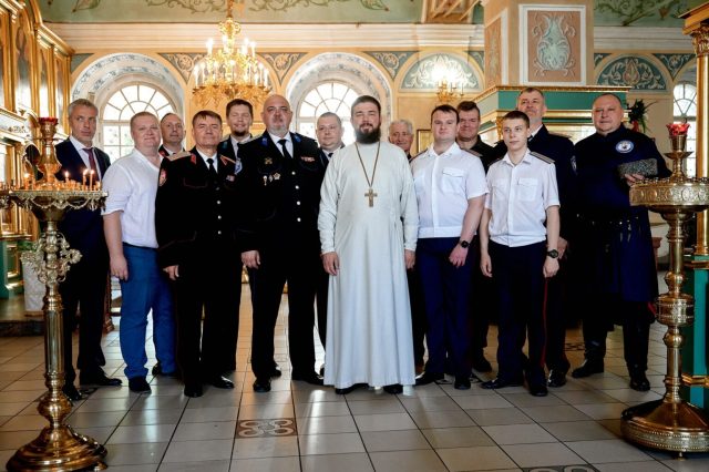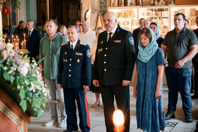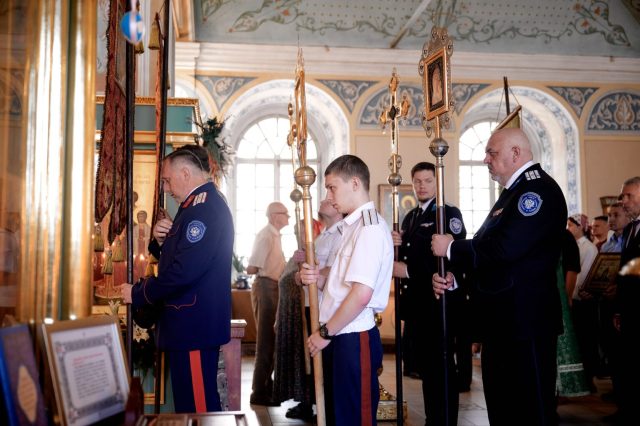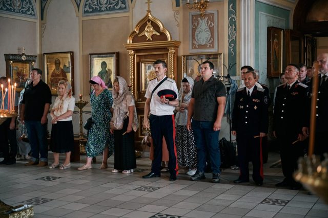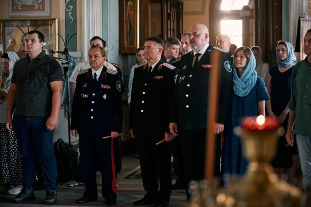 За Литургией молились руководитель Департамента национальной политики и межрегиональных связей Москвы Виталий Сучков, Верховный атаман Союза казаков Павел Задорожный, первый заместитель атамана Всероссийского казачьего общества Михаил Зорин вместе с офицерами штаба, казаки Центрального казачьего войска, преподаватели и студенты-казаки Первого казачьего университета, а также прихожане храма.