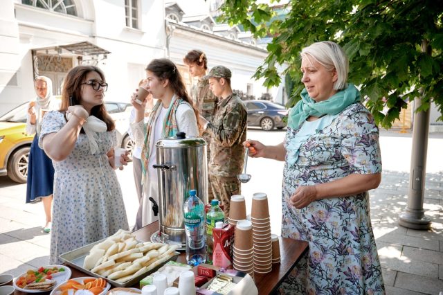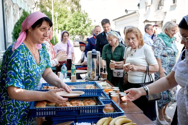 Празднование престольного дня продолжилось во дворе храма, где для верующих была приготовлена трапеза.