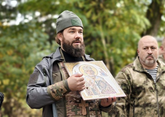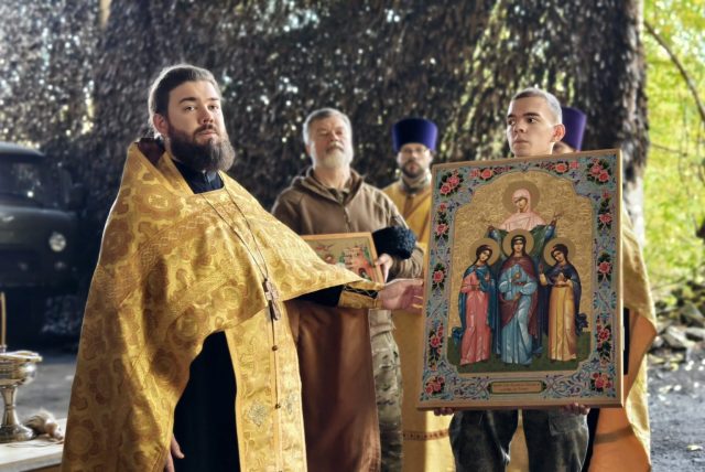 Бригаде «Терек» по благословению председателя Синодального комитета по взаимодействию с казачеством митрополита Ставропольского и Невинномысского Кирилла священник передал походный храм вместе с вышитым иконостасом, иконы святых мучениц Веры, Надежды, Любови и матери их Софии, и святого великомученика Георгия Победоносца с частицей мощей – покровителя всего русского воинства.