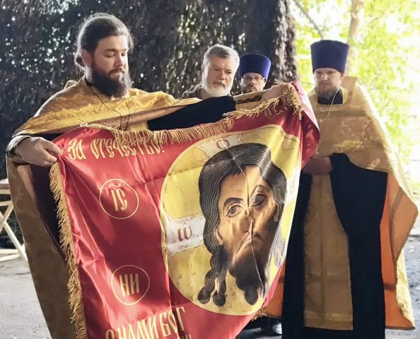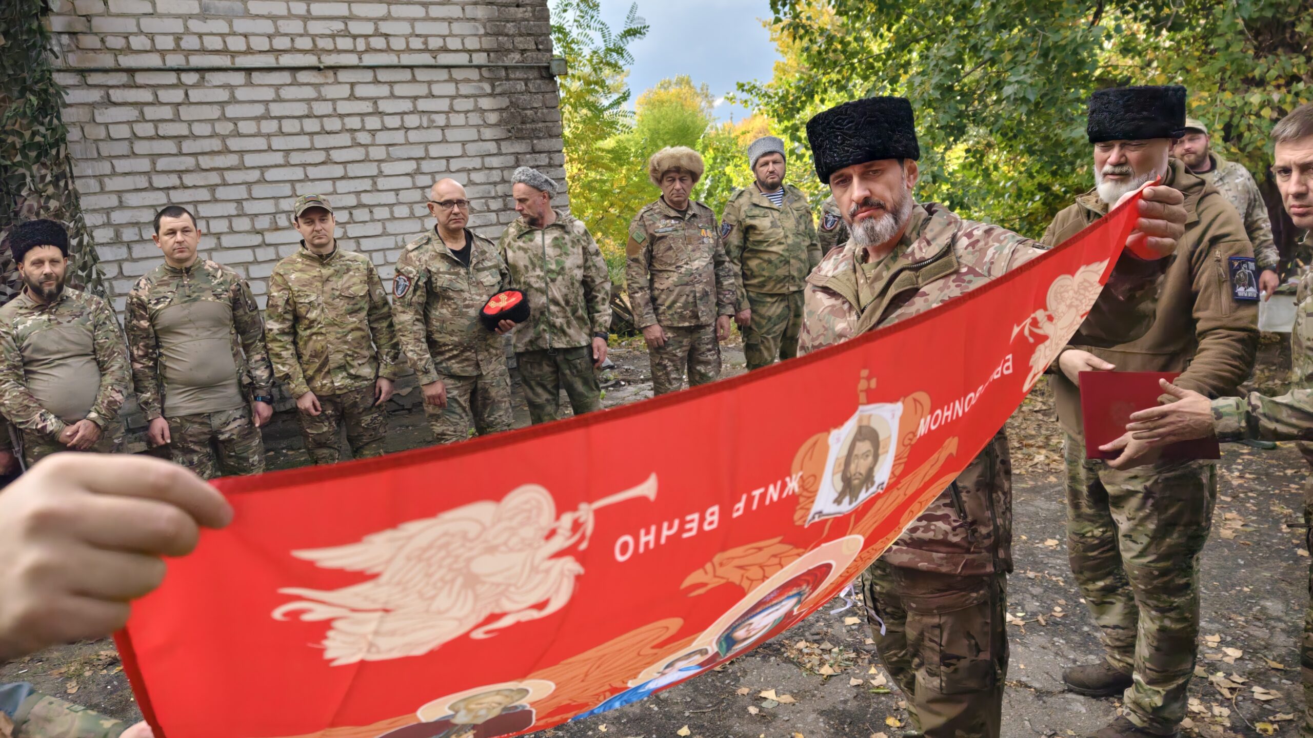 Духовник Всероссийского казачьего общества передал знамена с изображениями образа Спаса Нерукотворного и Пресвятой Богородицы казакам-воинам.