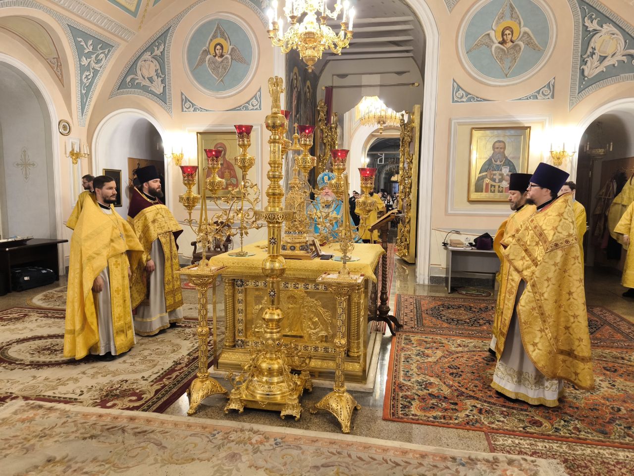 Божественную литургию, которая состоялась 14 декабря, возглавил почетный настоятель храма, председатель Синодального комитета по взаимодействию с казачеством, Синодального отдела по взаимодействию с Вооруженными Силами и правоохранительными органами митрополит Ставропольский и Невинномысский Кирилл. Архипастырю сослужили настоятель храма иерей Тимофей Чайкин, председатель Коллегии по окормлению казачества при Отделе по взаимодействию с Вооруженными силами правоохранительными органами и казачеством Сергиево-Посадской епархии протоиерей Александр Азаров, духовник молодежной казачьей организации Терского казачьего войска «Терцы» иерей Михаил Кузьменко и духовенство подворья. Вместе с духовенством и участниками Форума молились прихожане храма, столичные казаки и студенты МГУТУ им. К.Г. Разумовского.