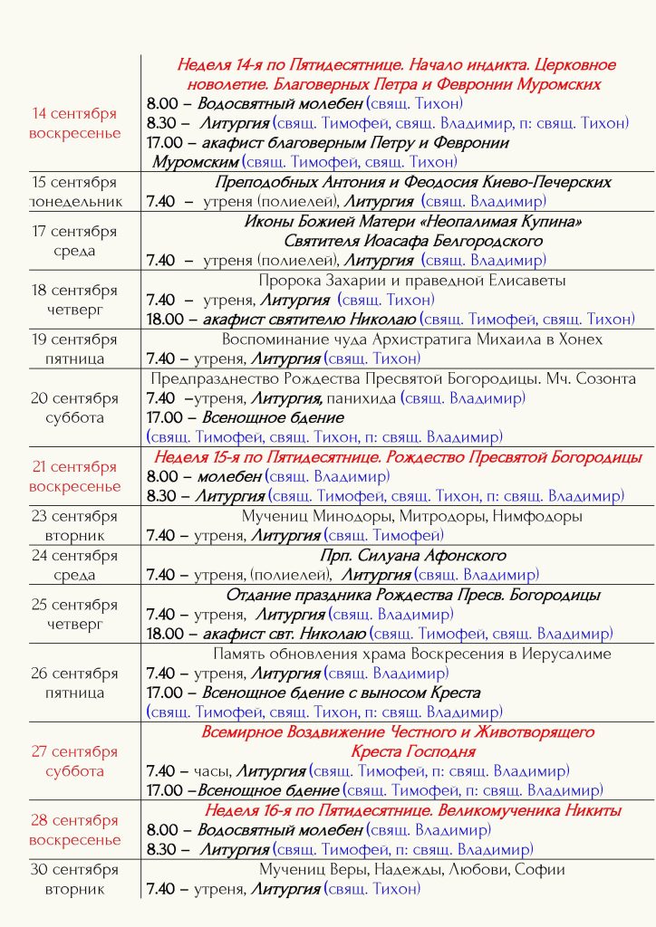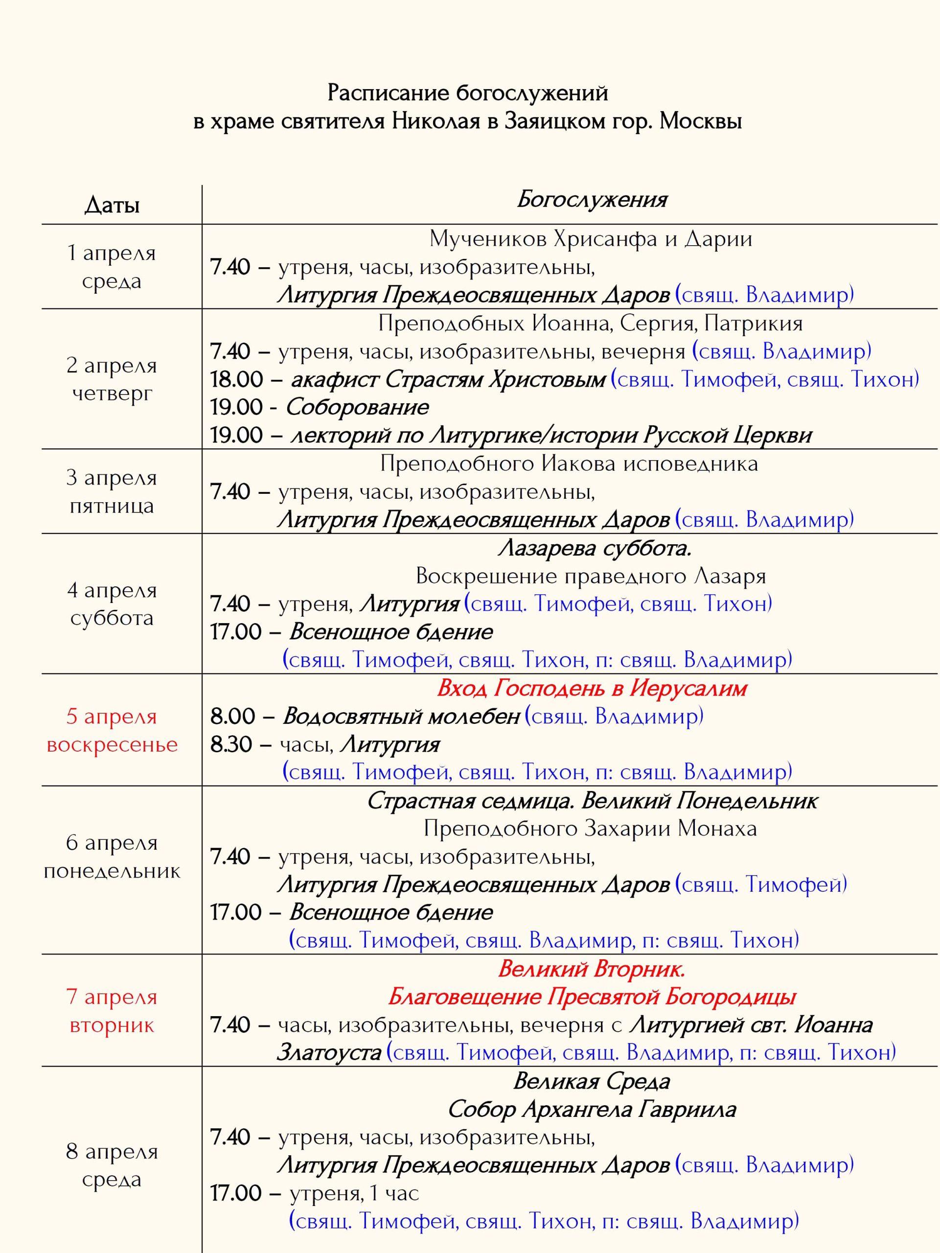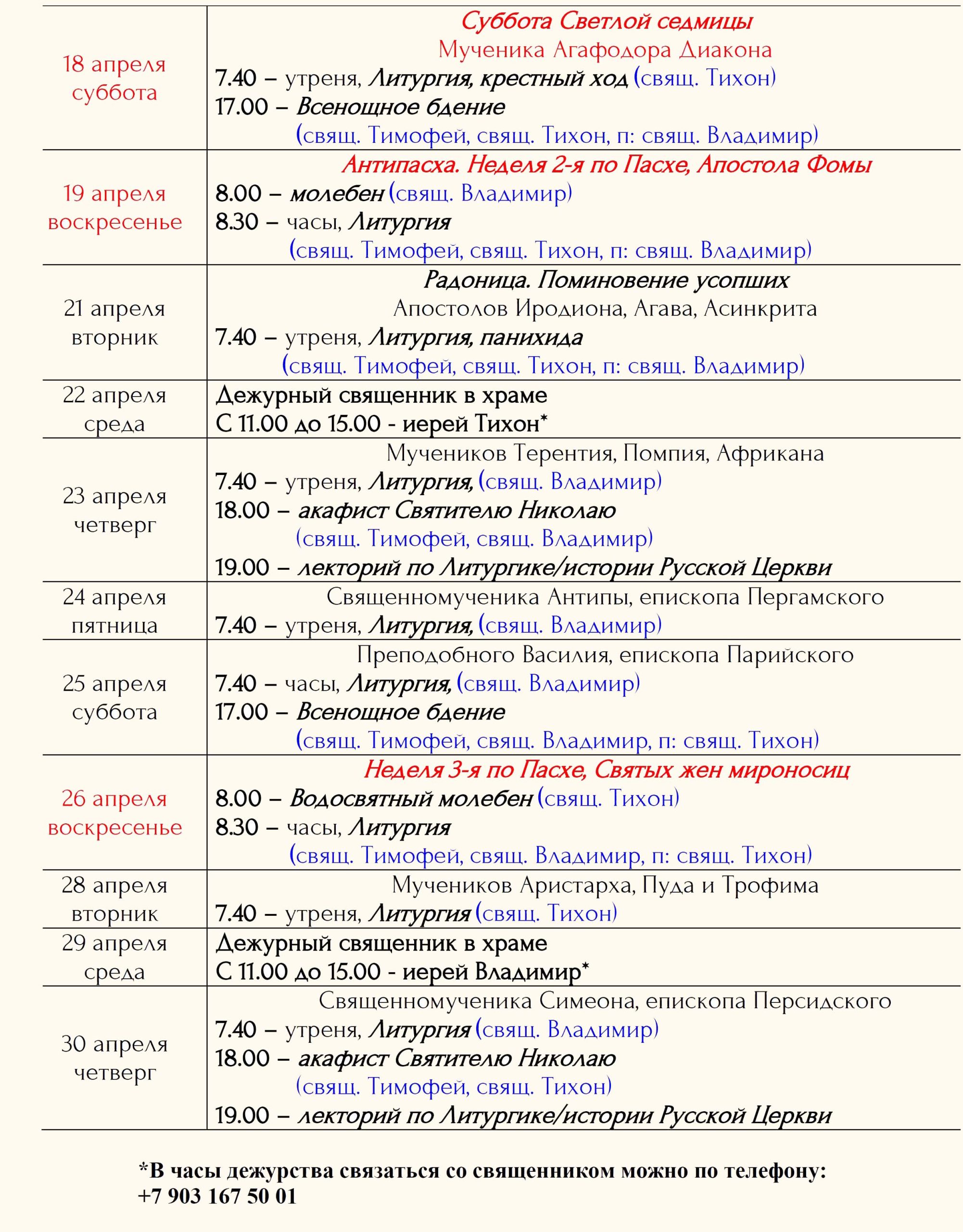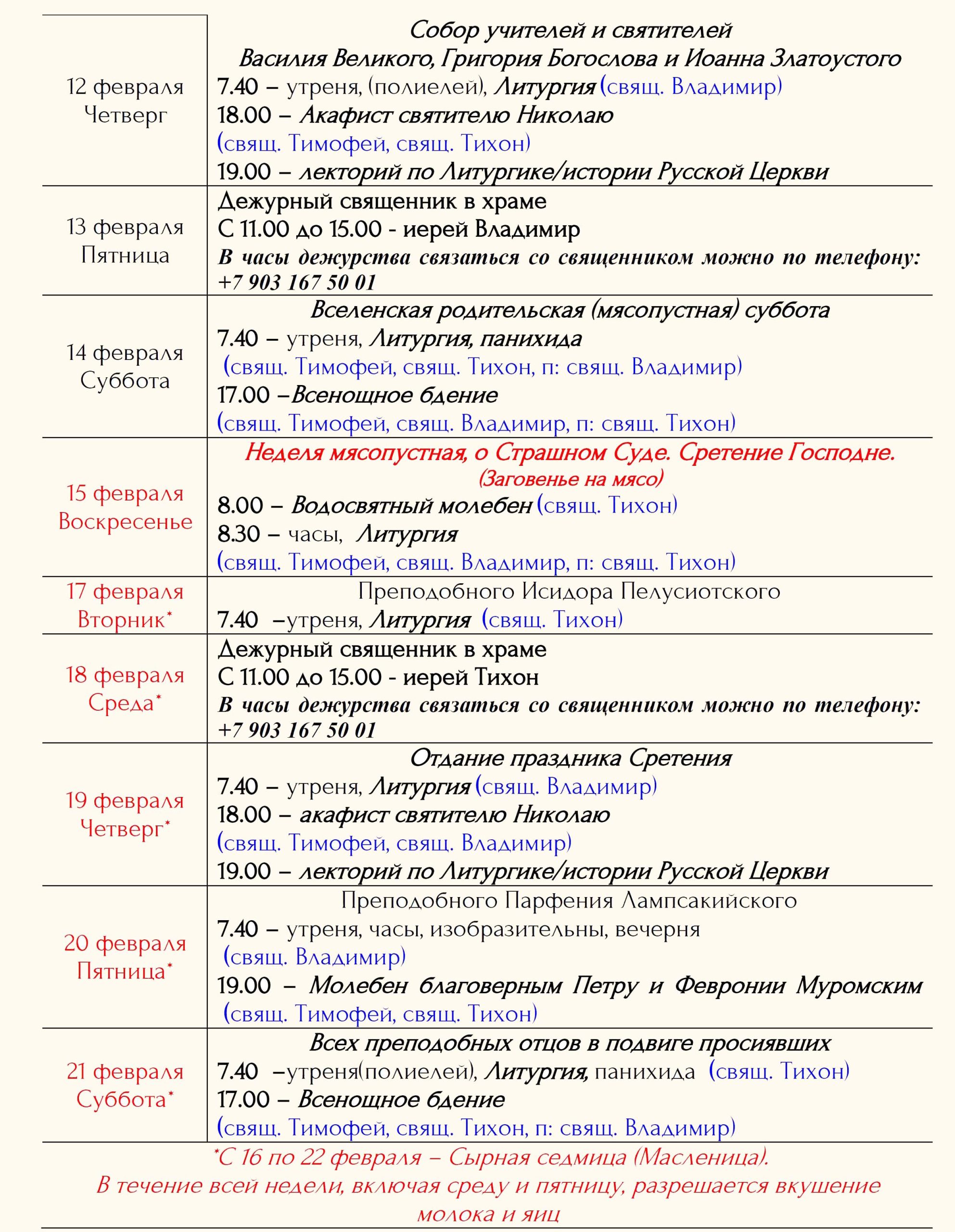 Расписание богослужений Храм открыт ежедневно с 7.00 до 19.00 Принимаются записки на сорокоусты – поименное сорокадневное поминовениео здравии или о упокоении во время проскомидии Божественной Литургии