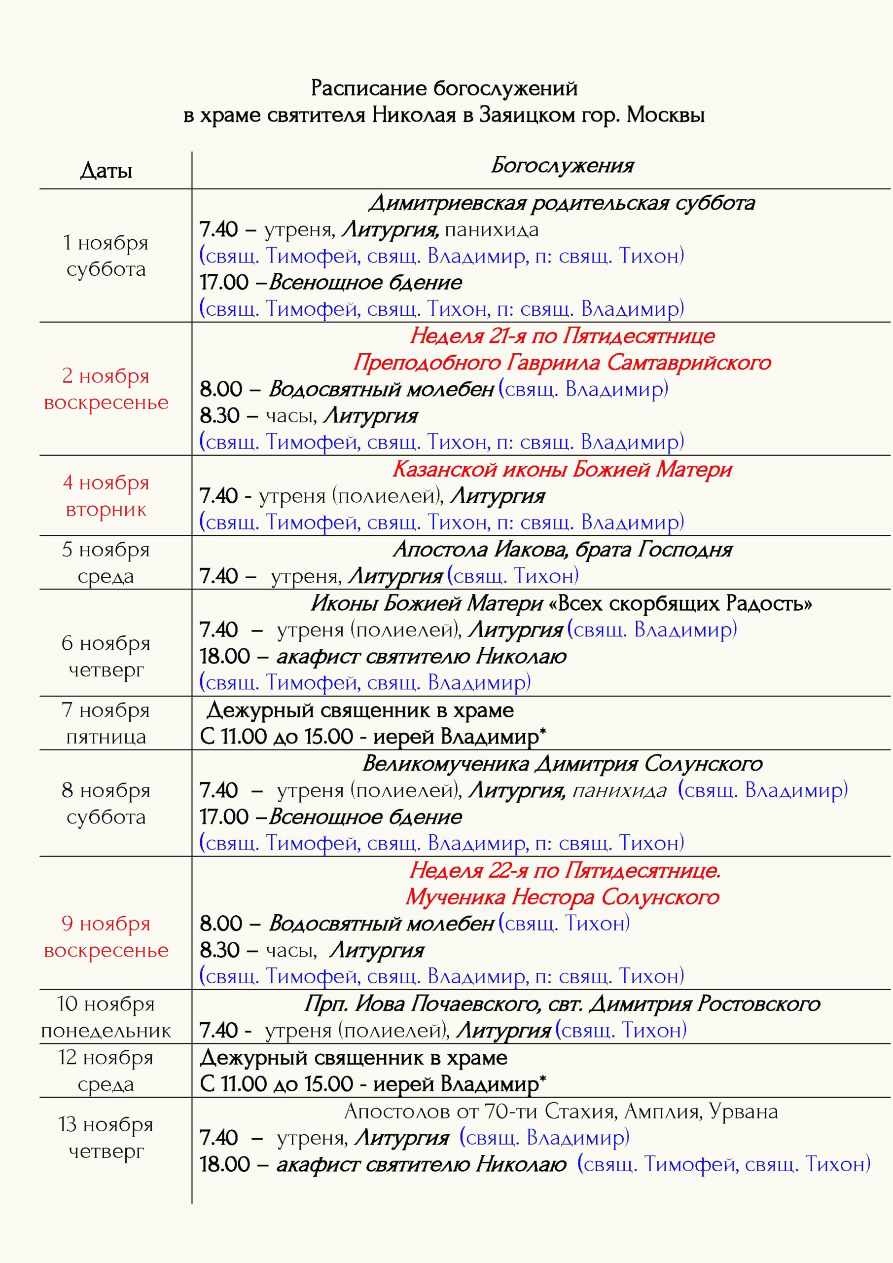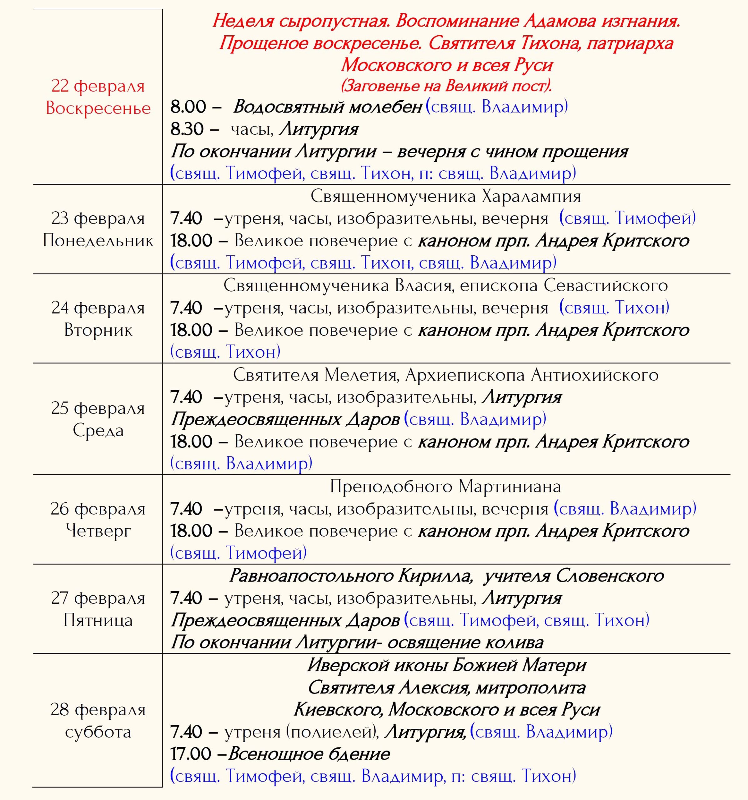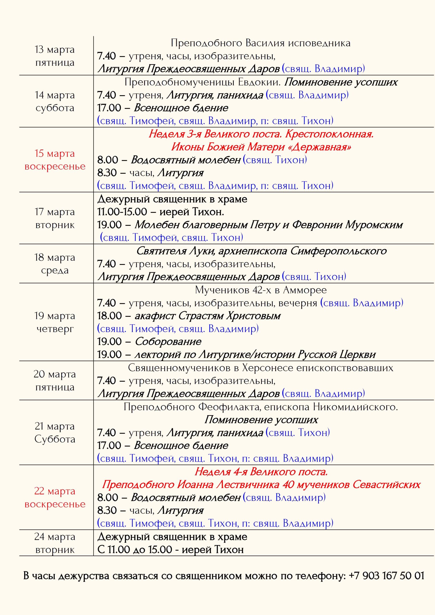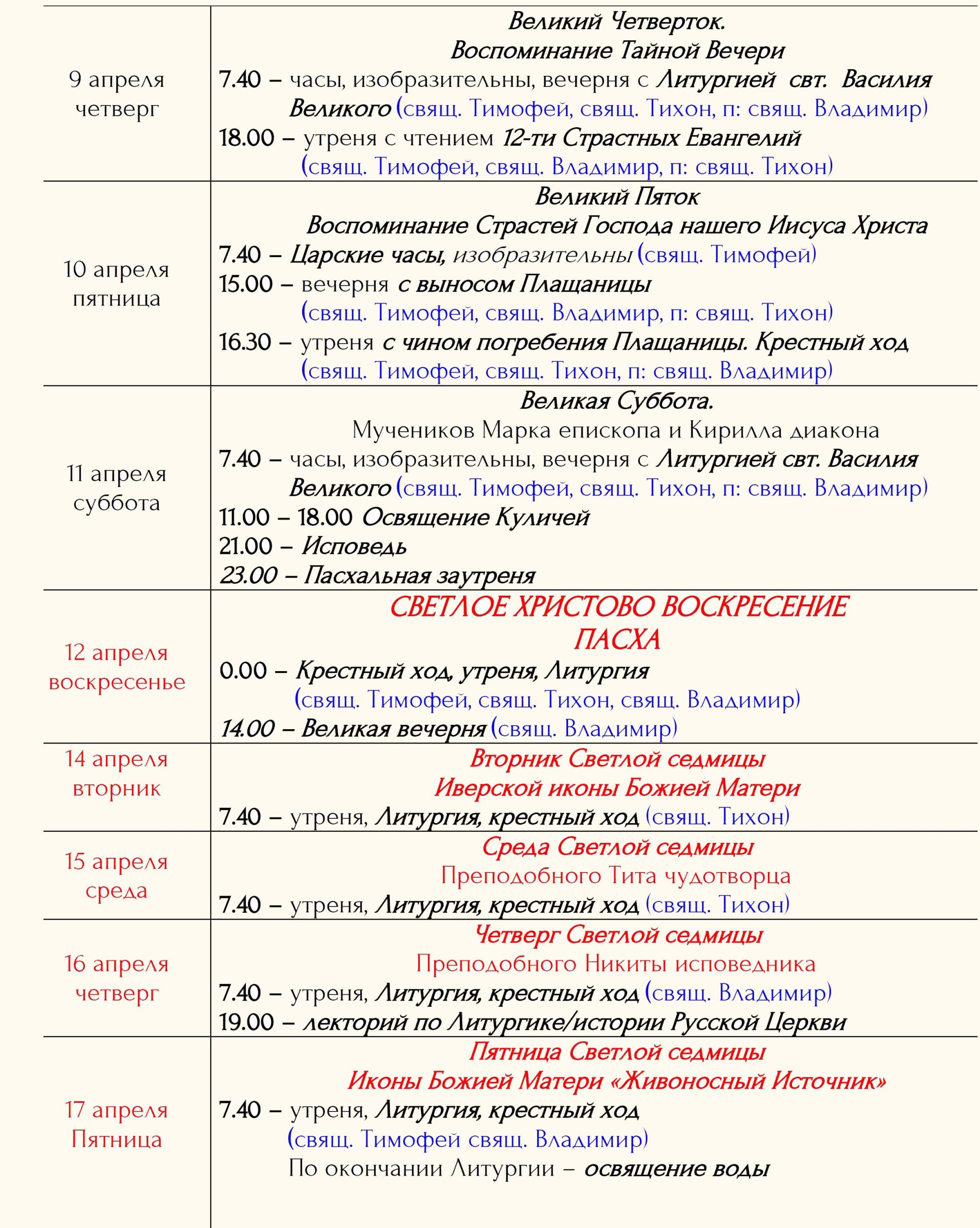 Расписание богослужений Храм открыт ежедневно с 7.00 до 19.00 Принимаются записки на сорокоусты – поименное сорокадневное поминовениео здравии или о упокоении во время проскомидии Божественной Литургии