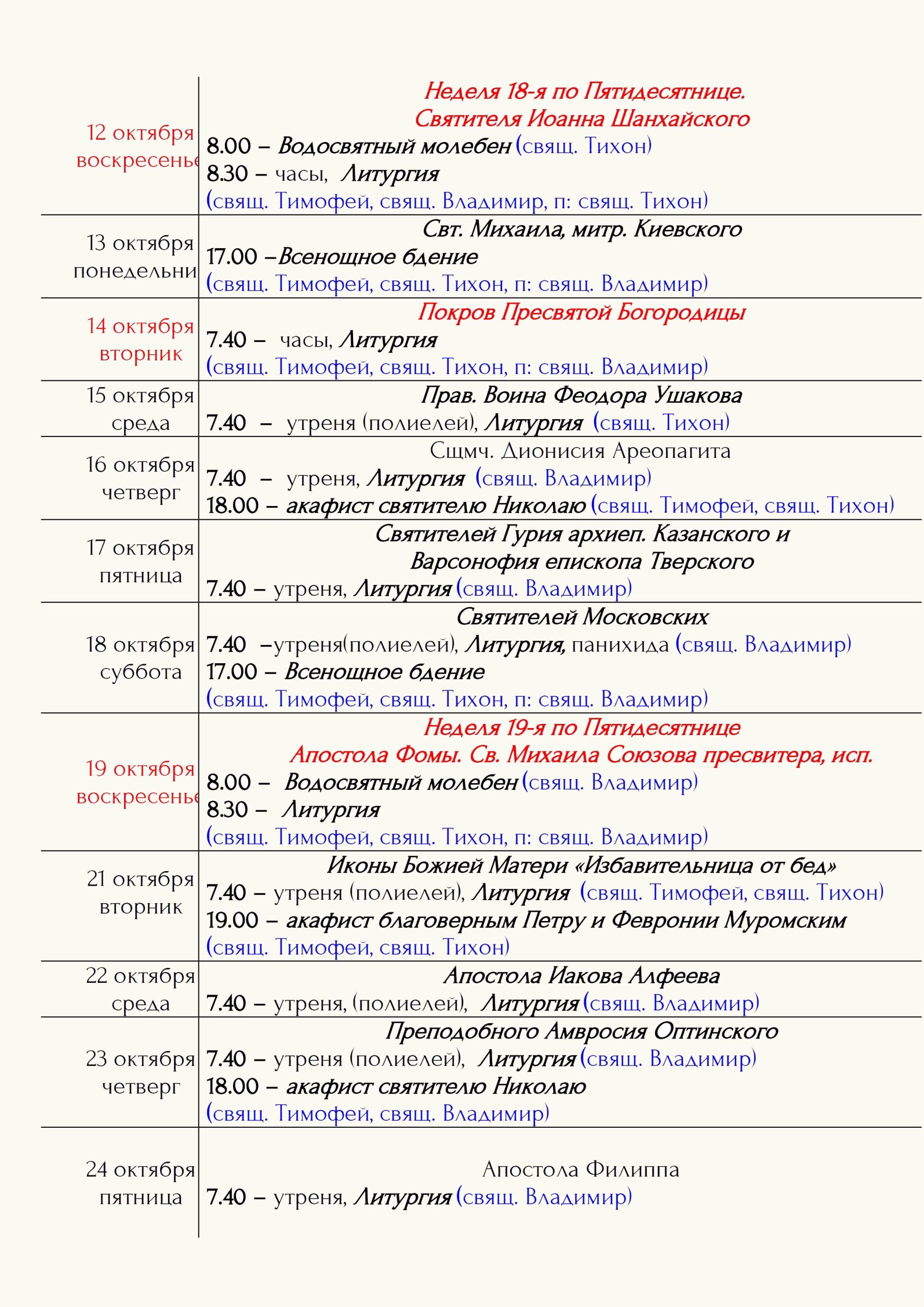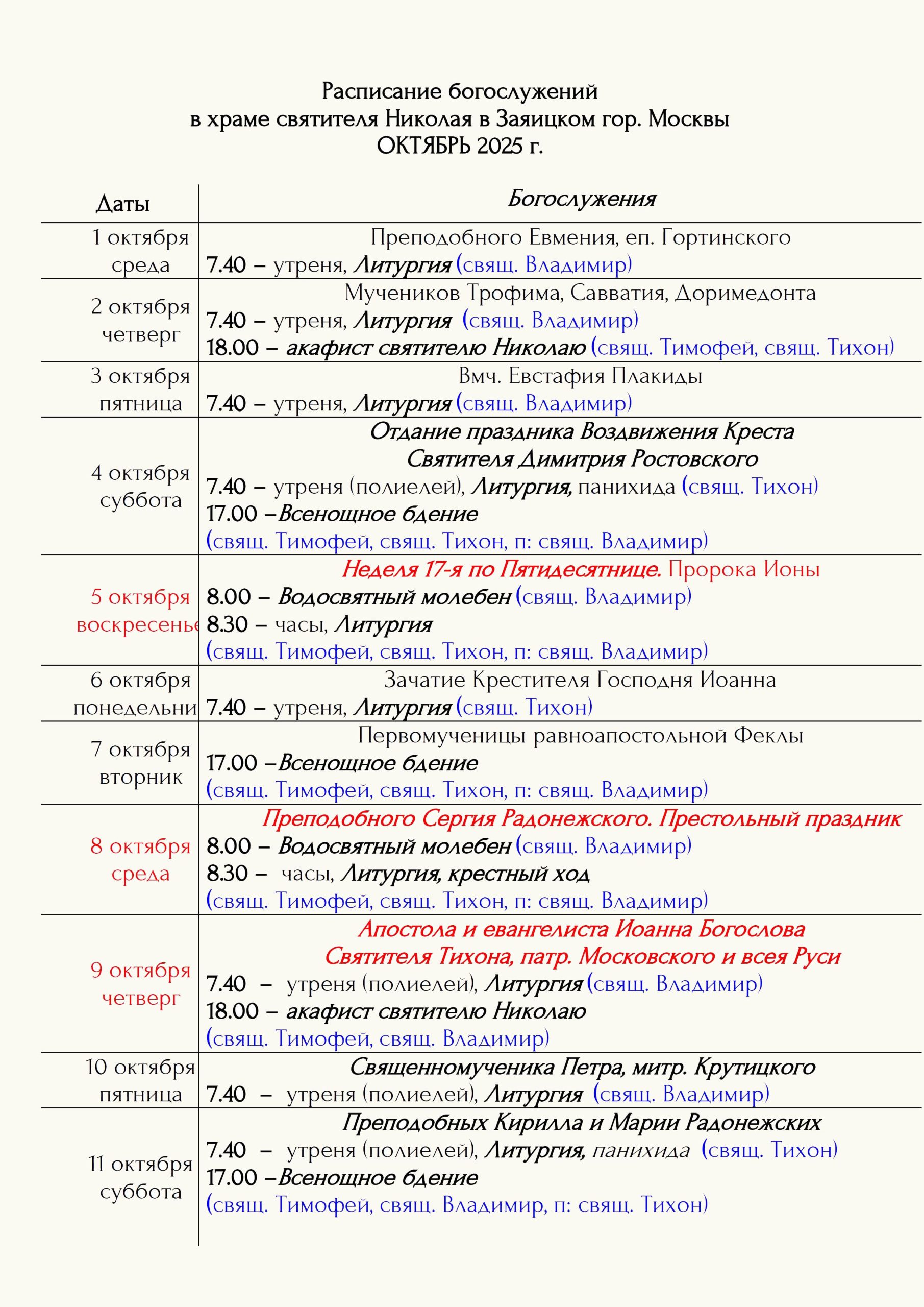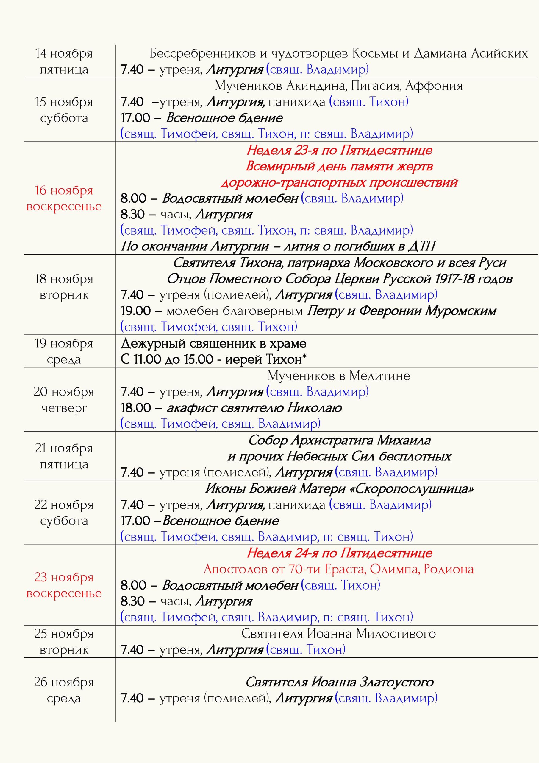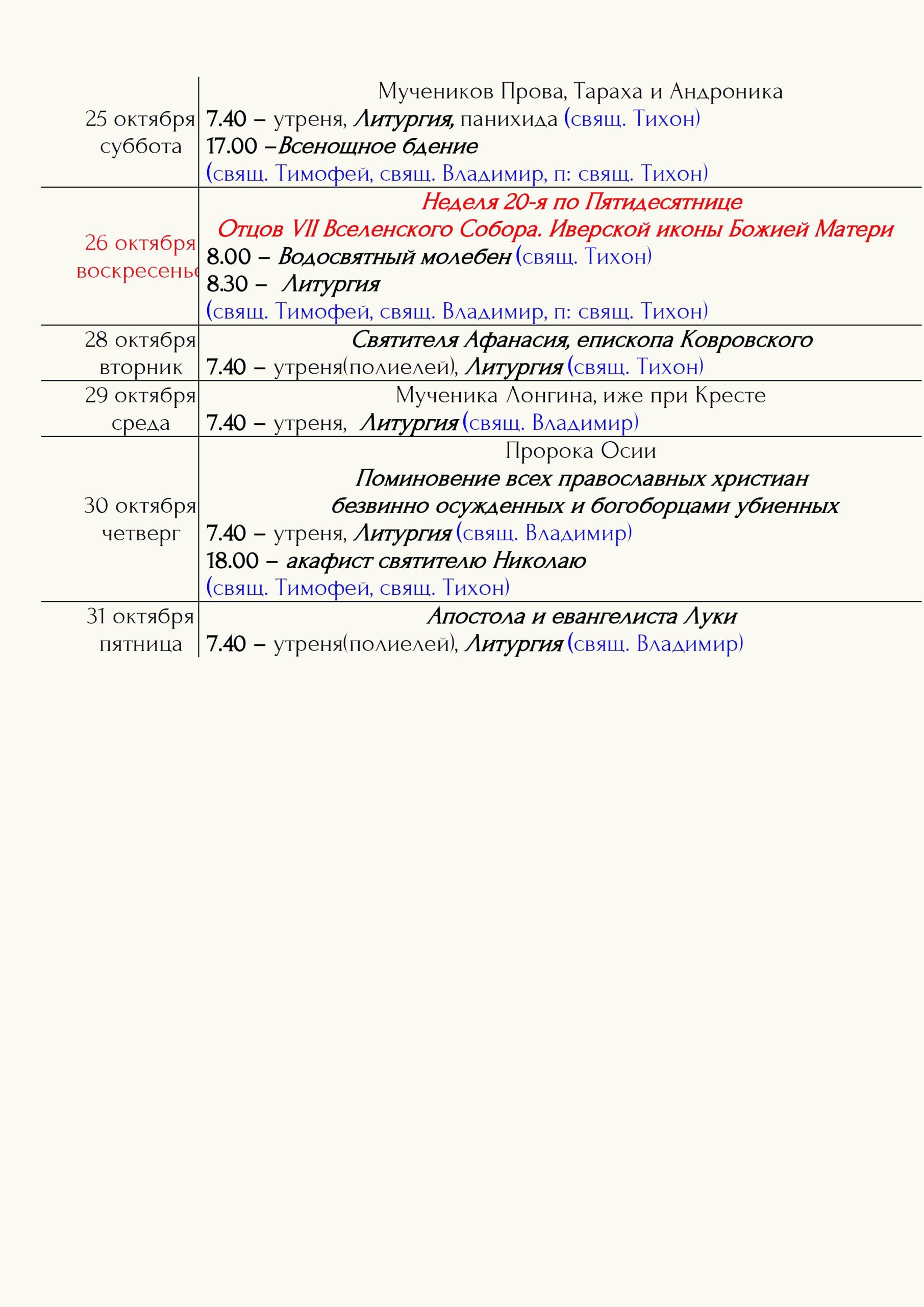 Расписание богослужений Храм открыт ежедневно с 7.00 до 19.00 Принимаются записки на сорокоусты – поименное сорокадневное поминовениео здравии или о упокоении во время проскомидии Божественной Литургии